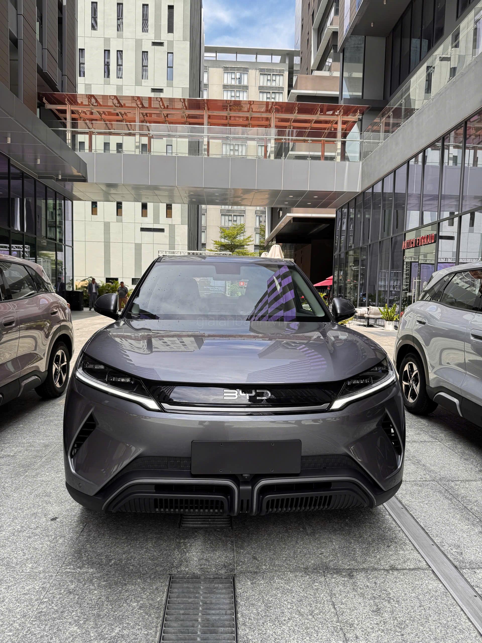 Lưới tản nhiệt kín đặc trưng của xe điện được phủ lớp sơn mờ , tích hợp camera 360° ẩn dưới logo BYD ở trung tâm . Logo thương hiệu BYD nổi bật ở vị trí trung tâm .
